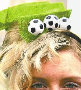 —名女模特在展示由“綠茵場”和“足球”組合成的頭飾(如右圖)。是不是很有創(chuàng)意?