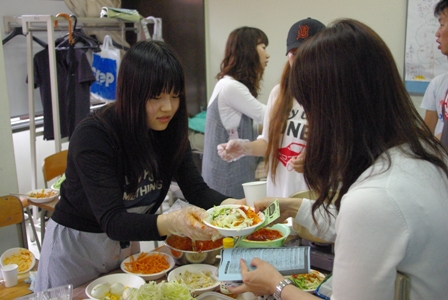 活動當天一大早,中國留學生就已經開始了如火如荼的準備。洗菜、準備食材、布置會場……為了能讓來訪的客人得到最好的體驗,大家都一絲不茍地進行準備。翼路學園2號館4樓主要是各國風味料理的品嘗區(qū)?斓11點,整個樓層彌漫著各種食物的香味。其中的特色食品包括有春卷、餃子、炸醬面還有韓國冷面等。11點活動開始以后各種買賣聲,吆喝聲不絕入耳,非常熱鬧。大家也都排隊耐心等待自己想要品嘗的食物。2號館5樓的內容比較豐富,有自由交易市場,各國的飲食文化介紹說明,中國的地域文化以及方言的說明。在韓國傳統(tǒng)服飾的展覽區(qū),你不僅可以看到各種彩色的韓國傳統(tǒng)服飾照片,還能實際穿上這些學生帶來的傳統(tǒng)韓國服飾,拍下照片,留下紀念。在表演日本的傳統(tǒng)節(jié)目“落語”時,大家都聚精會神地聽著臺上繪聲繪色的演出。