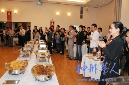 招待會上,留學人員載歌載舞表達著對祖國的祝福,每個人都沉浸在國慶佳節(jié)的氣氛中,大家品嘗著美味佳肴,談?wù)撝鎳陌l(fā)展變化,構(gòu)思著自己的美好未來。祖國的明天更美好——這是大家共同的心愿。