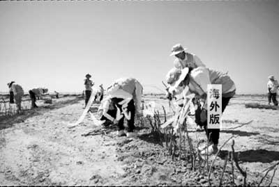 此次活動的主要任務是植沙障。原來,當?shù)胤乐紊郴饕欠N植了一種叫做堿蓬的植物,為了防止大風吹走堿蓬的種子,就將折斷的枯樹枝一排排整齊地插在土里,也就是沙障了。