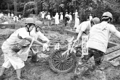 7月底的四川悶熱得很,幾乎每天的氣溫都在37攝氏度左右,即使是什么都不干,都會出汗。再加上為了避免曬傷,隊員們都穿著長袖上衣和長褲工作,更是熱得大汗淋漓。后來,趕上3天都在下雨,為了不延誤工期,大家就穿著雨衣堅持工作。志愿者們的想法很簡單:“因為我們不是工人,是志愿者,所以才要在雨天繼續(xù)工作,抓緊時間完成任務。我們想為在冬天來臨之前,讓更多的災民搬出簡易房,住進新房子盡一份力!”