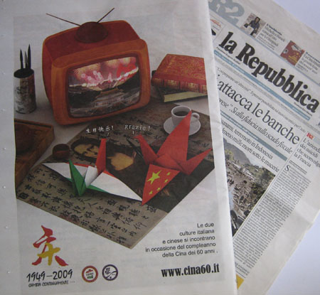 中新網(wǎng)10月3日電 據(jù)意大利《歐聯(lián)時報》報道,日前,在意大利佛羅倫薩學生學者聯(lián)誼會精心策劃下,中國國慶六十周年的宣傳廣告于10月1日被刊載在意大利共和國報紙上。廣告刊出后,引起了社會各界的高度關注,社會各界不約而同地把目光投向了中國,聚焦在中國60華誕的慶典活動。
