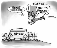 漫畫四:新浪網(wǎng)貼出的漫畫是一桿嚴(yán)重傾斜的秤,一頭是40萬百元大鈔,一頭是1500元大鈔,題為“留學(xué)所花40多萬元啥時(shí)才能賺夠本?”的文字說明憂心忡忡:不吃不喝,想要賺回40萬元得花20年。(萬建輝)