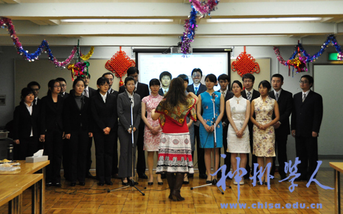 值得一提的是,出席晚會的日本友人新井清美女士也有感于現(xiàn)場的熱烈氣氛,主動登臺和幾位中國留學(xué)生一起唱起了《桃花朵朵開》,使現(xiàn)場氣氛更加歡快。