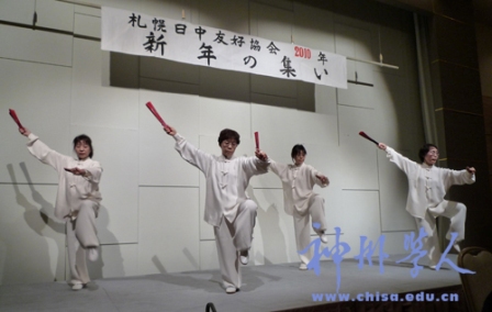 宴會中舉辦方為大家精心準備的日本舞蹈——千葉玉枝博得了來賓們的陣陣掌聲與由衷贊賞。札幌太極拳協(xié)會隨后的太極梅花扇表演更是把整個宴會推向了一個高潮。來自中國的各界朋友對日本友人的認真表演和對中國文化的宣揚表示了由衷的贊賞與謝意。