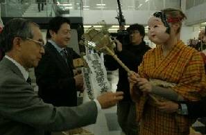 福岡市市長(zhǎng)吉田宏也參加了撒豆的儀式。他認(rèn)真地將一把豆子投進(jìn)魔鬼手中的袋子,并從裝扮成七福神的留學(xué)生手中接過(guò)了福岡市的象征物熊掌。