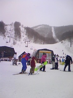 休息大廳前,大家都把滑雪器材放在這里,然后去休息。最近時(shí)興滑板子,所以放眼望上去都是各色滑雪板。