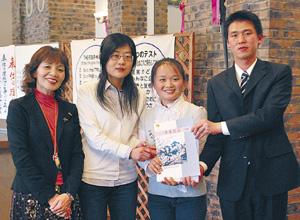 中新網(wǎng)3月5日電 據(jù)《日本新華僑報(bào)》報(bào)道,3月3日,日本和歌山縣“和歌山西輪轉(zhuǎn)俱樂(lè)部”在Laffina禮堂為即將畢業(yè)的留學(xué)生舉行了“畢業(yè)紀(jì)念相冊(cè)”贈(zèng)送儀式!昂透枭轿鬏嗈D(zhuǎn)俱樂(lè)部”的國(guó)際服務(wù)委員會(huì)的主井知子委員長(zhǎng)親手將“紀(jì)念相冊(cè)”交給了中國(guó)留學(xué)生鄭秋杰(26歲),金香梅(24歲)和代向斐(23歲)。據(jù)悉,該紀(jì)念相冊(cè)是和歌山縣專門為和歌山大學(xué)的留學(xué)生們制作的。