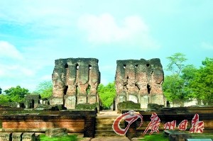 另一古城波隆納魯沃(Polonnaruwa)位于斯里蘭卡東北部,距首都科倫坡216公里,是11世紀(jì)到13世紀(jì)的王都。波隆納魯沃古城的建筑風(fēng)格樣式和布局結(jié)構(gòu)與古都阿努拉德普勒有很大不同,城內(nèi)沿中軸線布局,但其實(shí)質(zhì)還是受到了古都的影響。古都的大型人工湖波羅迦羅摩海始建于12世紀(jì),系波羅迦羅摩巴忽大帝把小型盤陀灌溉水庫拓建而成,堤岸長13公里多,高12米,面積24平方公里。岸邊立有巨大石像,高3.5米,據(jù)傳為波羅迦羅摩巴忽的雕像,雙手在胸前持軛,以示王權(quán)。