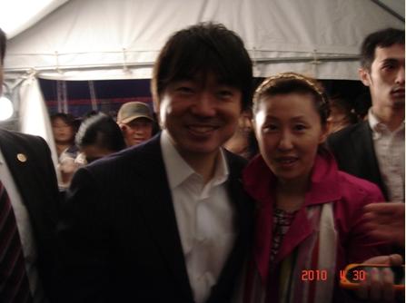 在大阪日本橋開(kāi)辦四川料理店鳳家的中國(guó)女留學(xué)生汪哲有幸接到了邀請(qǐng)函,不但進(jìn)入了會(huì)場(chǎng),還坐在橋下知事很近的座位上,演出結(jié)束后,汪哲突然產(chǎn)生了一股勇氣,來(lái)到了橋下知事的身邊,她大膽地拉住了橋下知事的手,向橋下知事介紹了自己在大阪宣傳上海世博會(huì)的努力,橋下知事也被上海世博會(huì)的慶祝氣氛深深地感染了,顯得很有興趣地聽(tīng)完了汪哲的自我介紹;接著汪哲乘勝追擊邀請(qǐng)橋下知事與她合影留念,并留下了珍貴的紀(jì)念照片。