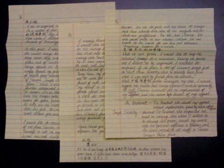 “…此時(shí)此刻,我希望專心于洗脫目前我被指控的罪名。長故事短說,他們(校方)將我的電話上的講話斷章取義,指控我“恐怖威脅” (他寫terrorist threat 而非檢方指控的terroristic threat) 。當(dāng)我問他們(校方)原因時(shí),史蒂文斯(技術(shù)學(xué)院)回避我的問題只是回答我“你應(yīng)該小心你的嘴”。之后,史蒂文斯(技術(shù)學(xué)院)學(xué)生發(fā)展部助理副總史德利(Joseph Stahley) 更回應(yīng)說“我有主導(dǎo)權(quán)! (I have the floor)”!爱(dāng)時(shí)我不明白(他指什么),他接著解釋說,這是一句美國俚語,意思是現(xiàn)在是我負(fù)責(zé)!…”