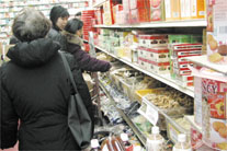 紐約東百老匯的中國城超市、香港超市也擠滿了買年貨的僑胞,其中以閩籍鄉(xiāng)親占多數(shù)。為吸引福州人,貨架上有多種從福建來的年貨。中國城超市一名員工說,年貨潮上個(gè)星期已經(jīng)開始了,福州鄉(xiāng)親好像怕遲買會(huì)賣光似的,都趕著一包兩包買回去,“中國人都要面子,過年不想失禮親朋的”。