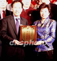 紐約華人社團聯(lián)合總會主席梁冠軍代表紐約僑界向代表團贈送了“鋪經(jīng)貿(mào)橋梁、謀科技騰飛”的牌匾。