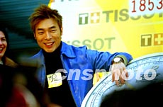 瑞士天梭表TISSOT全球總裁弗朗索瓦·添寶(右)十四日在上海新天地向香港明星許志安(左)贈送名表,由此展開其世界巡回展中國大陸地區(qū)第一站。作者:劉殊瑾
