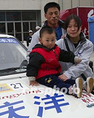 北京慶洋拉力車隊車手陳德安駕駛捷達GTX賽車,參加2003年中國汽車拉力賽上海站比賽。在22日發(fā)車儀式前,特意從北京趕來的妻子與兩歲的兒子前來助陣,期望取得好成績。作者:趙振清