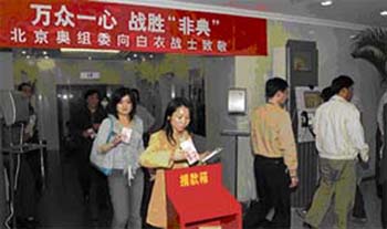 北京奧運(yùn)會的申辦和籌辦工作,一直得到全國人民的大力支持。此時(shí)此刻,向戰(zhàn)斗在一線的醫(yī)務(wù)工作者奉獻(xiàn)愛心,是我們向社會應(yīng)做的回報(bào)。我們相信,在以胡錦濤同志為總書記的黨中央堅(jiān)強(qiáng)領(lǐng)導(dǎo)下,在廣大醫(yī)務(wù)工作者的辛勤努力下,全國人民團(tuán)結(jié)一心,眾志成城,我們一定能夠依靠科學(xué)的力量和集體的智慧,打贏非典型肺炎防治工作的攻堅(jiān)戰(zhàn),奪取最后的勝利。