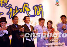 正在香港熱播的《譴綣仙凡間》電視劇收視報(bào)捷,眾演員5月16日開香檳慶祝收視理想。中新社傳真 洪少葵 攝