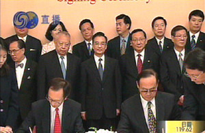簽字儀式下午三時(shí)在香港禮賓府舉行。在國(guó)務(wù)院總理溫家寶和香港特區(qū)行政長(zhǎng)官董建華見(jiàn)證下,商務(wù)部副部長(zhǎng)安民和香港財(cái)政司司長(zhǎng)梁錦松代表雙方在協(xié)議書(shū)上簽字。
