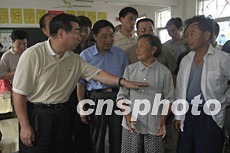 七月六日,國務(wù)院副總理回良玉(圖左1)專程到安徽滁州,看望已得到安全轉(zhuǎn)移的受災(zāi)群眾。中新社記者:盛佳鵬