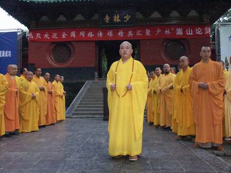 少林寺方丈釋永信在少林寺山門前主持盛大的歡迎儀式。釋永信在致歡迎詞時說:“嵩山論劍--中國互聯(lián)網(wǎng)新聞宣傳高峰論壇在少林寺召開,少林古剎古老的文明和現(xiàn)代科技將在這里碰撞與對接。