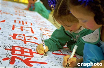 十六日,在上海徐家匯公園的“圓飛天夢(mèng),鑄民族魂”——上海市民慶!吧裰邸蔽逄(hào)飛船成功返回活動(dòng)現(xiàn)場(chǎng),幾名上海兒童在慶功條幅上簽名,該簽名長卷將存列于航天科技館內(nèi),并擬在今后的發(fā)射中帶入太空。作者:劉殊瑾