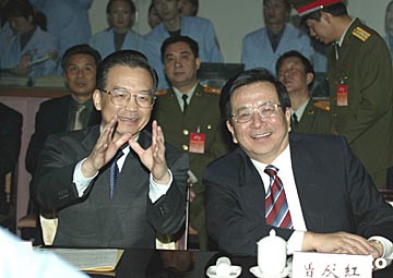 十月十六日,溫家寶和曾慶紅共同觀看神舟五號(hào)載人飛船返回全過(guò)程。作者:張桐勝