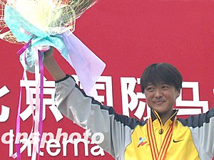 前不久在法國巴黎世界田徑錦標(biāo)賽上取得一枚銅牌的孫英杰是二00三年三星北京國際馬拉松賽女子組唯一的奪冠“大熱門”。在比賽過程中,孫英杰始終處于領(lǐng)跑的第一集團(tuán)之中,并于后半程脫穎而出,最終以二小時(shí)十九分三十九秒的成績輕松奪得女子組冠軍,創(chuàng)造北京國際馬拉松賽女子組歷史最好成績。