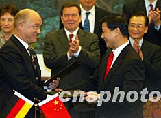 中德雙方十二月一日在北京簽署多個(gè)合作文本,中國(guó)總理溫家寶、德國(guó)總理施羅德共同出席簽字儀式。中新社記者:滿會(huì)喬