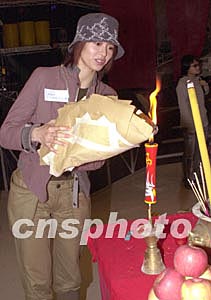 歌星梁詠琪12月5日在香港出席香港將軍澳電視城出席《第十五屆CASH流行曲創(chuàng)作大賽》彩排及拜神儀式,圖為梁詠琪在拜神儀式上化緣,祈求6日晚在大賽中有優(yōu)異演出及獲獎。中新社記者:鄧慶樂
