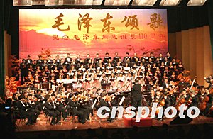 為紀(jì)念毛澤東誕辰110周年,《毛澤東頌歌大型音樂(lè)會(huì)》十二月五日晚在北京民族宮劇場(chǎng)舉行。中國(guó)最高級(jí)別文藝團(tuán)體演出的歌唱毛澤東頌歌,讓人回憶起激情燃燒的歲月。中新社記者:史利