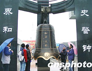 由南京鋼鐵集團(tuán)澆鑄的“和平大鐘”十二月十一日正式落戶南京大屠殺遇難同胞紀(jì)念館,以銘記歷史教訓(xùn),祈禱世界和平。大鐘高3米,寓意紀(jì)念30萬(wàn)遇難同胞;總重量6.6噸,表示大鐘于南京大屠殺遇難者66周年祭日鑄建;下擺口徑為1.937米,意為日軍全面侵華及南京大屠殺發(fā)生的年份。該鐘外形仿明式青銅古鐘樣式,鐘體正面是著名書法家啟功書寫的“和平大鐘”鐘名,背面刻有“前事不忘、后事之師,以史為鑒、開創(chuàng)未來(lái)”16個(gè)大字,兩側(cè)分別刻有銘文和浮雕。作者:丁梅