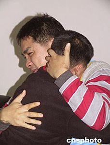 因涉嫌在海南從事間諜活動(dòng)被拘押的臺(tái)灣人宋孝濂在海南看守所與前來(lái)探視的兒子宋睿庭相抱痛哭。作者:王辛莉