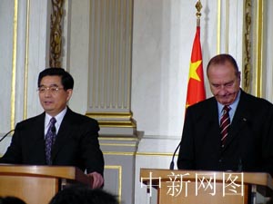今天是中法建交四十周年紀(jì)念日,正在法國進(jìn)行國事訪問的中國國家主席胡錦濤和希拉克在巴黎進(jìn)行了正式會(huì)談,會(huì)談后雙方簽署了“中法聯(lián)合聲明”。該聲明強(qiáng)調(diào),中法兩國將深化全面戰(zhàn)略伙伴關(guān)系,致力于建立更加安全、更加尊重多樣性和更加團(tuán)結(jié)的世界。