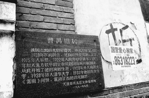 2月16日,記者(注:人民日?qǐng)?bào)記者)在天津民主道23號(hào)曹禺舊居院墻上看到,緊挨著天津市文物局和天津市河北區(qū)文物管理所等單位懸掛的兩塊曹禺舊居紀(jì)念牌的,是一個(gè)約60厘米高的墨寫(xiě)的“拆”字(如圖),旁邊還張貼著花花綠綠的各類“搬家公司”的小廣告。旁邊有的住家已人去樓空,三三兩兩收破爛的外地人正在曹禺故居外來(lái)回轉(zhuǎn)悠。