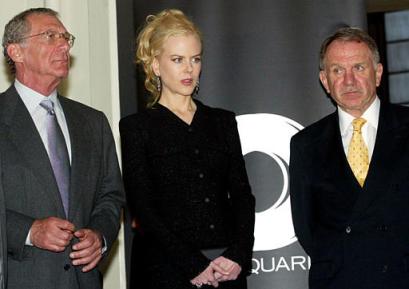 妮可·基曼(中)和導(dǎo)演波拉克(左)在澳大利亞常駐聯(lián)合國(guó)代表(右)為劇組舉行的招持宴會(huì)上。 (圖據(jù)美聯(lián)社)
