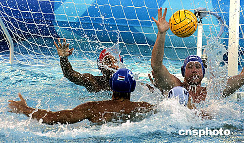 圖為在當(dāng)?shù)貢r間8月23日舉行的埃及隊和西班牙隊的水球比賽畫面。