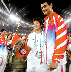 閉幕式上,為中國隊打旗的人變成了奪得110米欄金牌的劉翔,他與希臘旗手雙雙走在最前列。姚明葉莉兩人則“藏身”在后邊的大部隊中,姚明身穿中國代表團的紅色外套,葉莉一身白色T恤,身后寫著“相聚北京2008”的字樣。兩人剛進(jìn)場時,姚明甚至親昵地將手搭在女友的肩膀上。身高1.90米的葉莉在身高2.26米的姚明映襯下,顯得嬌小可人。