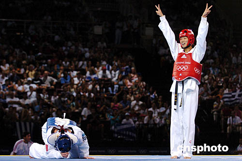圖為在當?shù)貢r間8月29日舉行的女子67公斤級的跆拳道比賽中,中國選手陳中擊敗法國選手為中國隊奪得第32枚金牌。