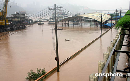 圖為重慶市渝中區(qū)化龍橋一處被淹,只剩一根電桿尚余頂部露出水面。
