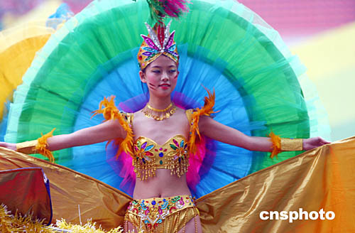 圖為盛裝的重慶女孩在花車(chē)上展示當(dāng)代重慶人的激情和魅力。
