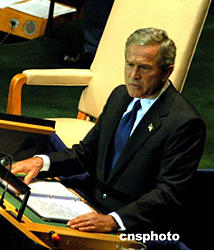 美國總統(tǒng)布什繼巴西總統(tǒng)盧拉后第二個(gè)發(fā)言,這也是聯(lián)大一般性辯論的慣例。布什繼續(xù)向國際社會(huì)宣傳伊拉克戰(zhàn)爭的必要性,說伊拉克戰(zhàn)爭是為了世界的和平與公正,因?yàn)橐晾耸冀K沒有全面遵守安理會(huì)的有關(guān)決議,所以必須承擔(dān)嚴(yán)重后果。布什還慷慨解囊,提議在聯(lián)合國建立“民主基金”,許諾美國將首先給予資助,他認(rèn)為“民主基金”將幫助一些國家建立法律法規(guī)、獨(dú)立的法庭、自由出版物、政黨和貿(mào)易聯(lián)盟,并由此打下民主的基礎(chǔ)。