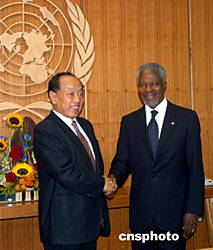 當?shù)貢r間九月二十七日,正在紐約聯(lián)合國總部出席第五十九屆聯(lián)大的中國外長李肇星與聯(lián)合國秘書長安南會晤,雙方就聯(lián)合國作用、改革和發(fā)展以及蘇丹達爾富爾等問題交換了看法。作者:趙海燕