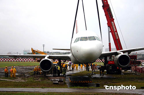 今晨本社記者透過機場圍墻看到,工作人員正在開動吊車吊起事故飛機。飛機距離機場圍墻只有數(shù)十米的距離,在草地中的機頭已被吊起,改變了飛機昨晚發(fā)生事故時尾巴翹起、機頭朝下的姿態(tài)。但截至發(fā)稿時,此間電視臺報道,拖離事故飛機的進(jìn)程不甚順利。松山機場最快要到早上九點半才能恢復(fù)運營。