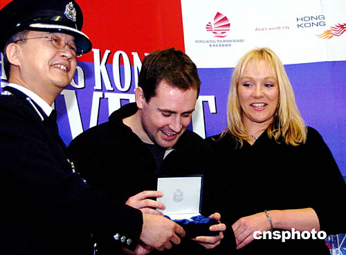 香港旅發(fā)局主席周梁淑怡與香港入境事務(wù)處機(jī)場管制科指揮官蔡普特,今天在機(jī)場舉行歡迎儀式,向芭芭拉頒發(fā)證書,贈(zèng)送香港旅游發(fā)展局水晶帆船等紀(jì)念品,共祝香港旅游邁進(jìn)新旅程。