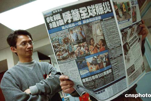 香港報刊報導(dǎo);南亞海嘯世紀(jì)大災(zāi)難首次傳來港人死訊,1名39歲香港男子證實在泰國布吉死亡,在這次災(zāi)難中,另有213港人失去聯(lián)絡(luò)。12月 29日上午,市民閱讀當(dāng)天新聞密切關(guān)注有關(guān)消息。作者:洪少葵