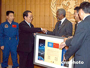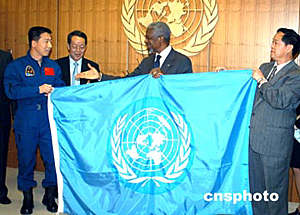 去年今年九月“神五”升空前四十天時,聯(lián)合國維也納辦事處代表安南秘書長,把一面聯(lián)合國旗幟移交給中國常駐維也納代表團,并現(xiàn)場轉(zhuǎn)交給中國載人航天工程辦公室。后來,這面聯(lián)合國旗和中國國旗伴隨楊利偉,在太空繞地球運行十四圈,行程約六十萬公里。今天,中國載人航天工程代表團訪問紐約聯(lián)合國總部。代表團成員楊利偉把這面旗幟正式移交回聯(lián)合國。