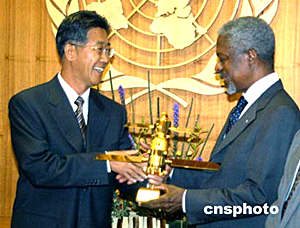 胡世祥把一個金光閃閃的“神舟”五號飛船模型贈送給安南秘書長,并表示,聯(lián)合國在和平利用外層空間等國際事務(wù)中發(fā)揮著積極和重要的作用。中國航天界感謝安南秘書長和世界人民對中國航天事業(yè)的支持。中國人民愿與國際同行加強合作,為全人類探索與和平利用外空的事業(yè)作出更大貢獻。