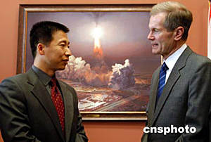 當?shù)貢r間五月二十日下午,中國首飛航天員楊利偉在華盛頓拜會美國上世紀八十年代的航天員、現(xiàn)任國會參議員比爾·納爾遜,兩人展開了真誠而幽默的對話。中新社記者:余東暉