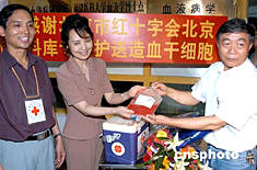 六月二十二日晚,中國造血干細(xì)胞捐獻(xiàn)者資料庫北京管理中心主任金輝(中)福建醫(yī)科大學(xué)附屬協(xié)和醫(yī)院主任醫(yī)師陳志哲(右)移交北京首例在校大學(xué)生骨髓捐獻(xiàn)者造血干細(xì)胞,以緊急用于該院福建十三歲少年謝輝骨髓移植手術(shù)。作者:劉可耕