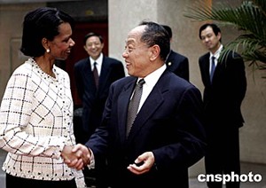中新網(wǎng)7月8日電 中國(guó)外交部長(zhǎng)李肇星今天同來訪的美國(guó)總統(tǒng)國(guó)家安全事務(wù)助理賴斯舉行會(huì)談。